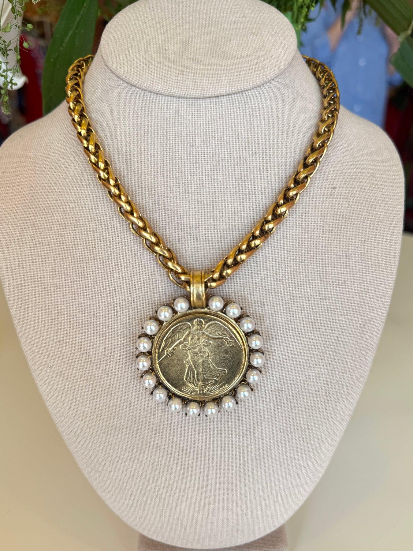 Our chunky gold necklace is 22K gold plated over brass with a large coin encircled with pearls. Each piece is personalized and handcrafted for you by one of the artisans in New York's fashion district. Inspired by nature, history and fashion such as pearls, coins, and tortoise.
