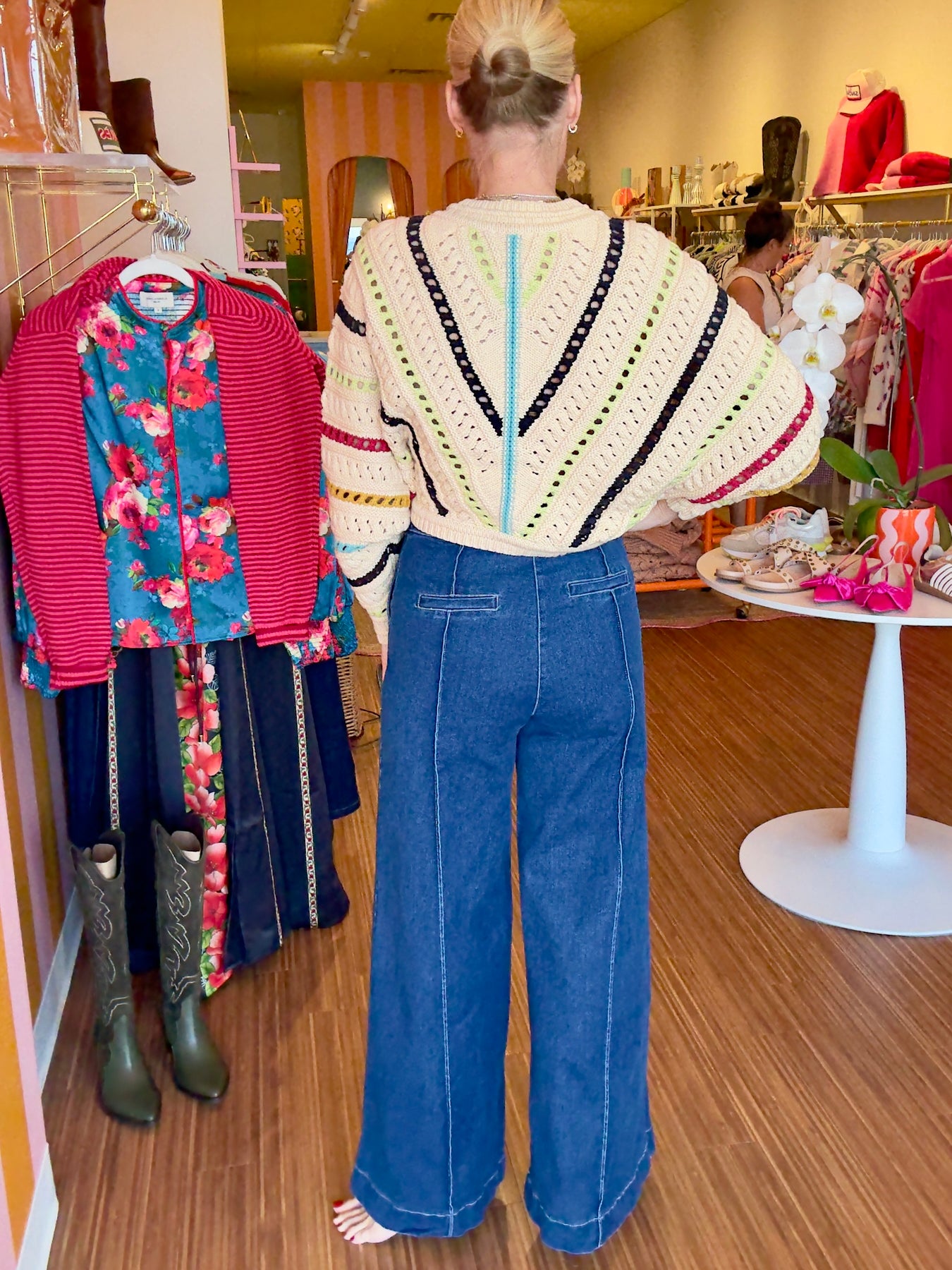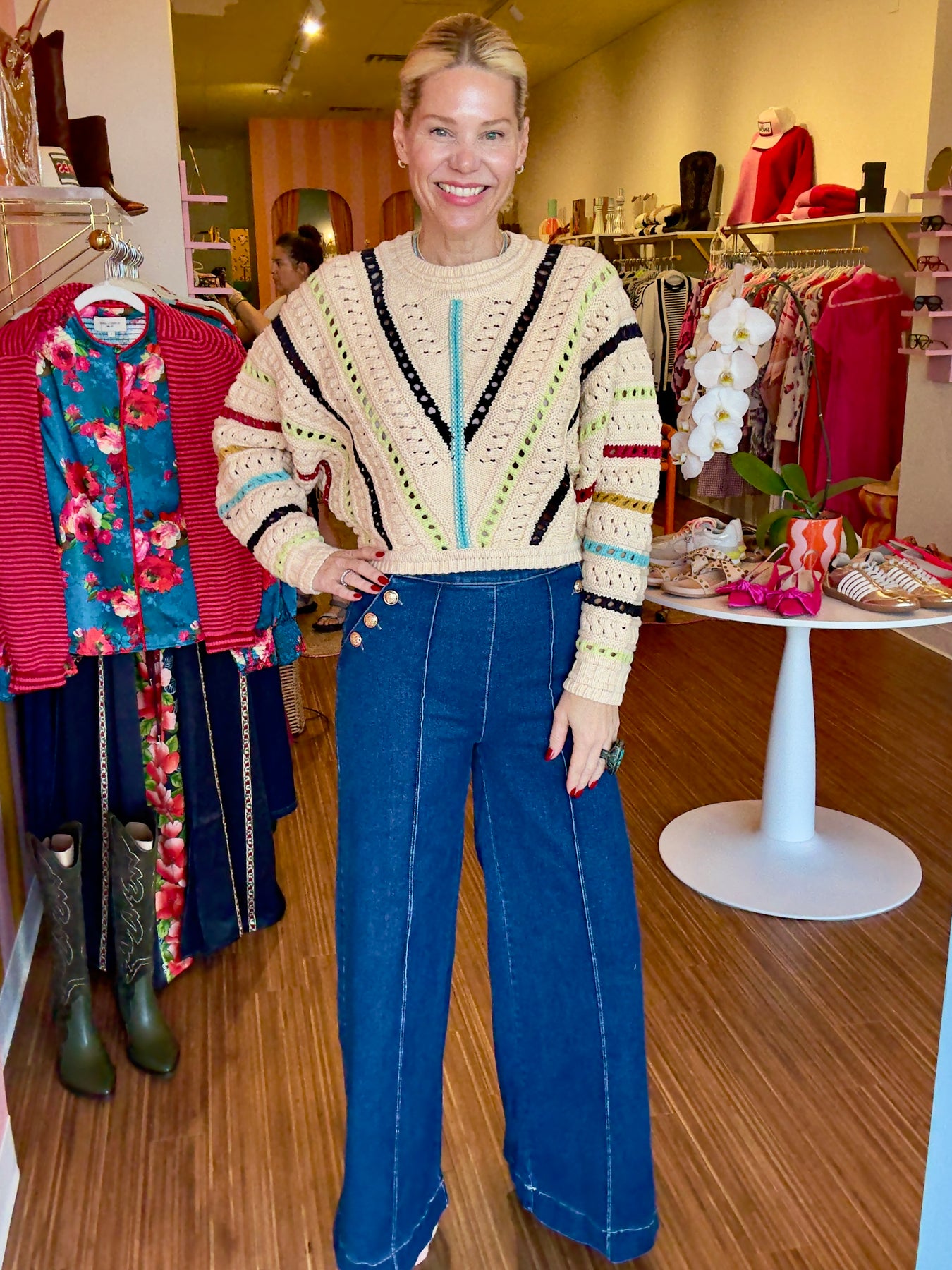 Washed denim pant with flattering center seam and two side button closure.  Wide leg.  Fit is true.