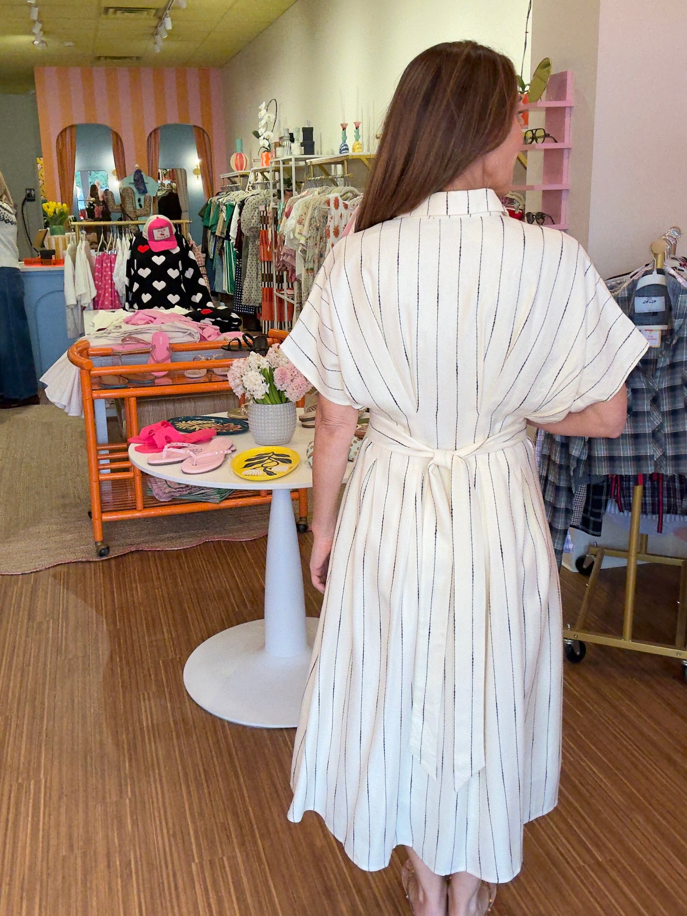 Midi length dress perfect for the spring season.  This viscose and linen dress is lined in 100% cotton to keep things cool with a dolman sleeve, pleats, back tie waist in ivory with fine black pin stripe.  Fit is very true in this brand.