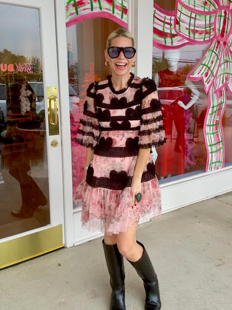 Lovely pink tulle floral print dress with black lace details that give it a Parisian vibe. 3/4 sleeve and back zipper. Fits true to size.