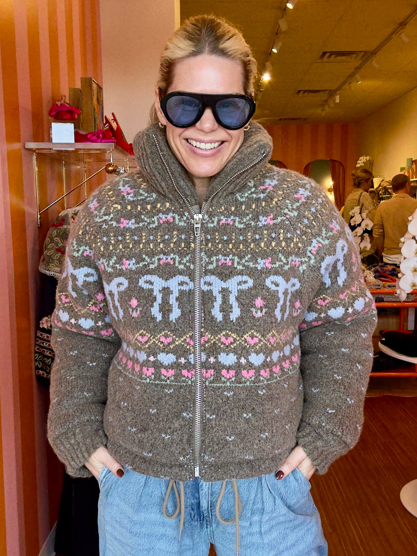 Adorable puffer jacket with sweet fair isle vibes. Hits at waist. Fit is true.