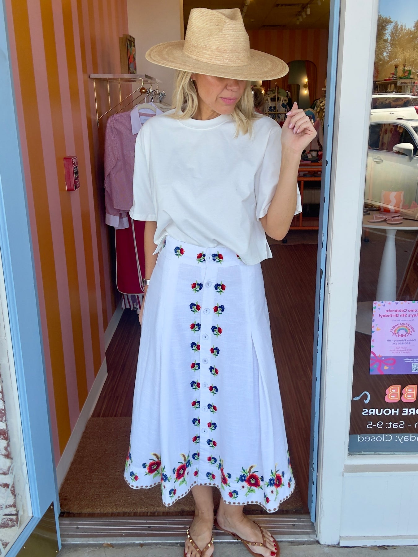 The Berri Midi Skirt is a beautifully crafted A-line piece featuring intricate floral embroidery that has artisanal details. Designed with a classic button-down front and a high-waisted fit, it creates a sophisticated and cohesive head-to-toe look when paired as a set. Fit is true in this brand