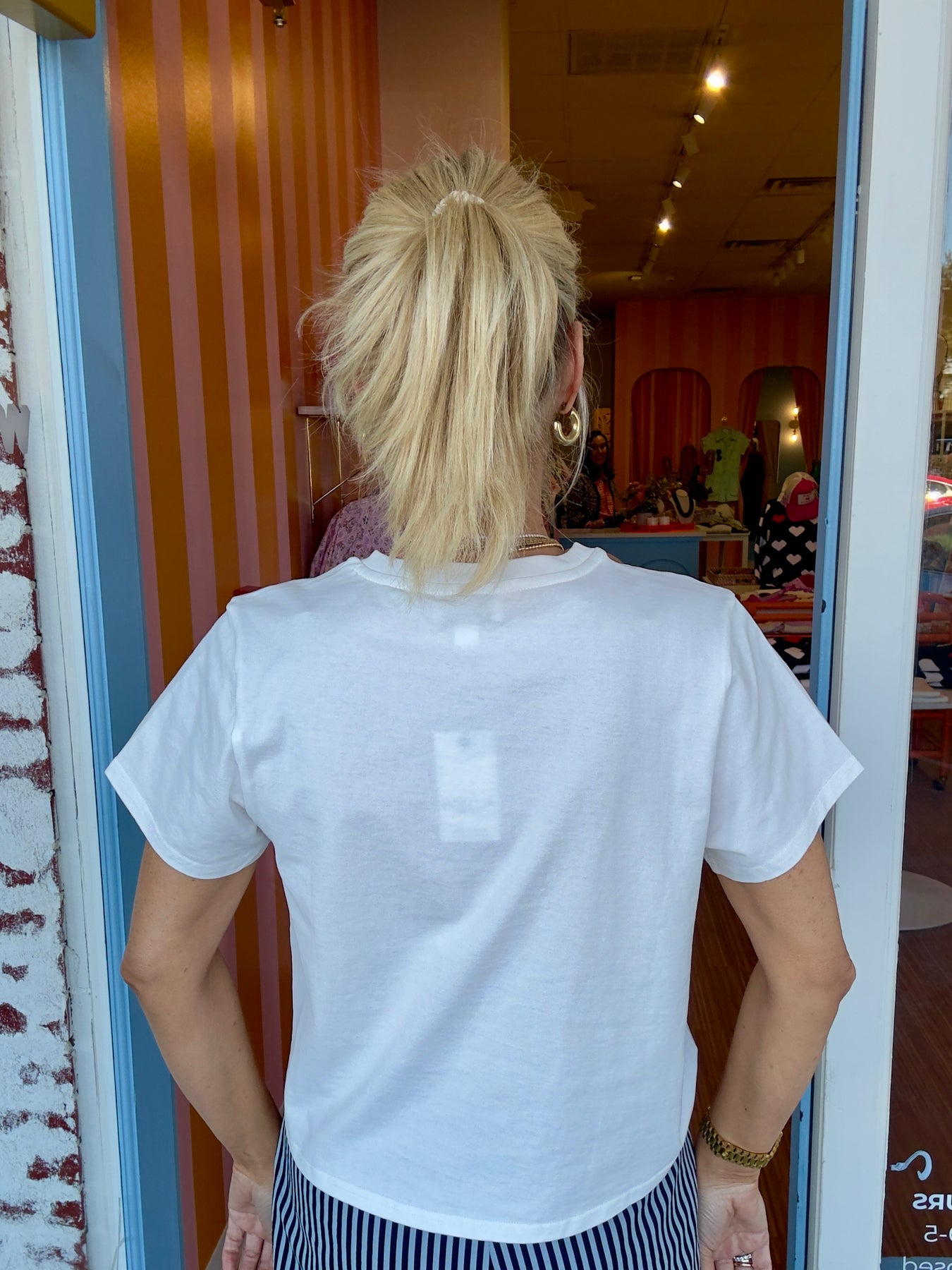 Easy cotton white tee with adorable black embroidered hearts from Allison New York.  Fit is true.