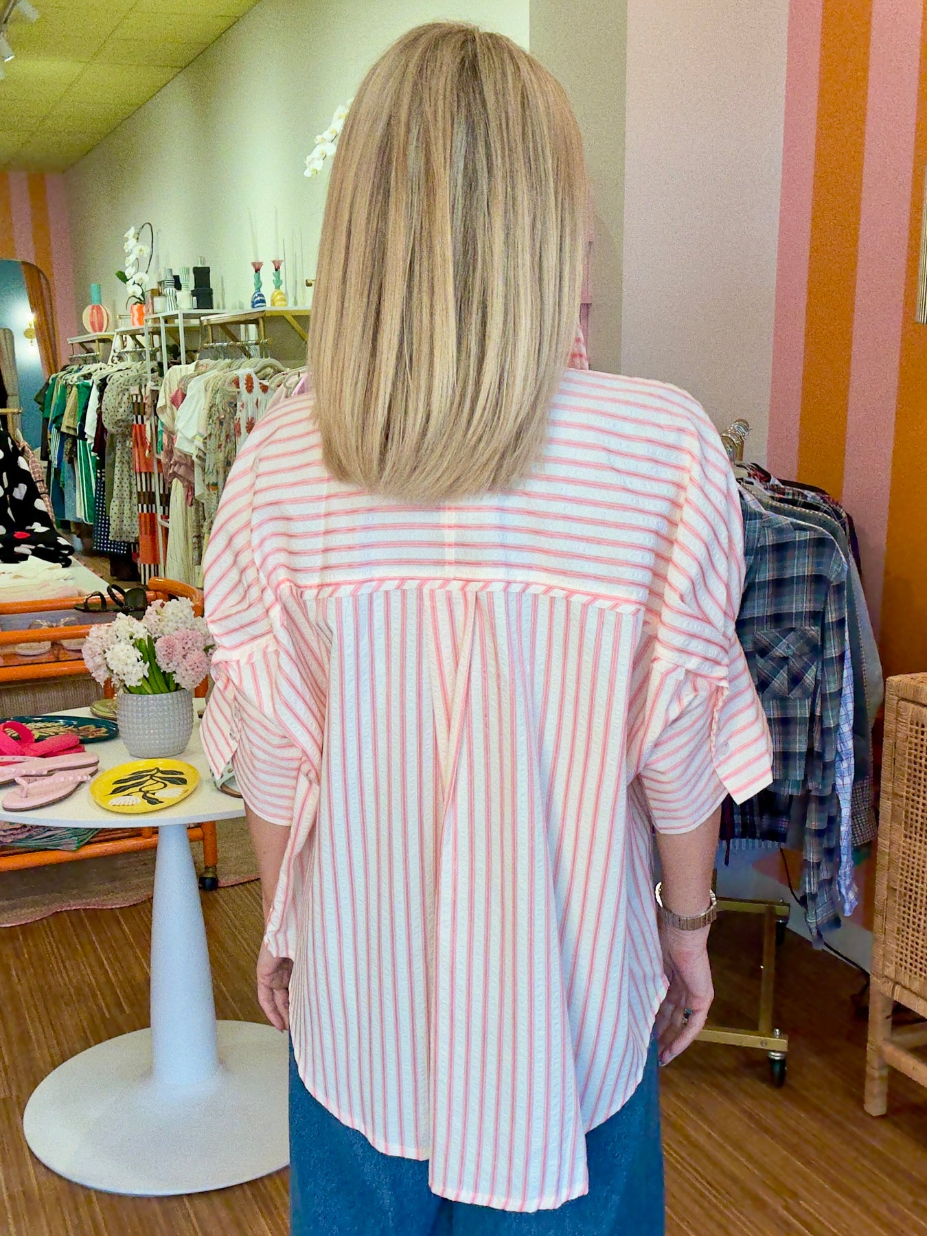 Pale pink and ivory seersucker button down with dolman sleeve and high low hem. Fit is oversized, but true.