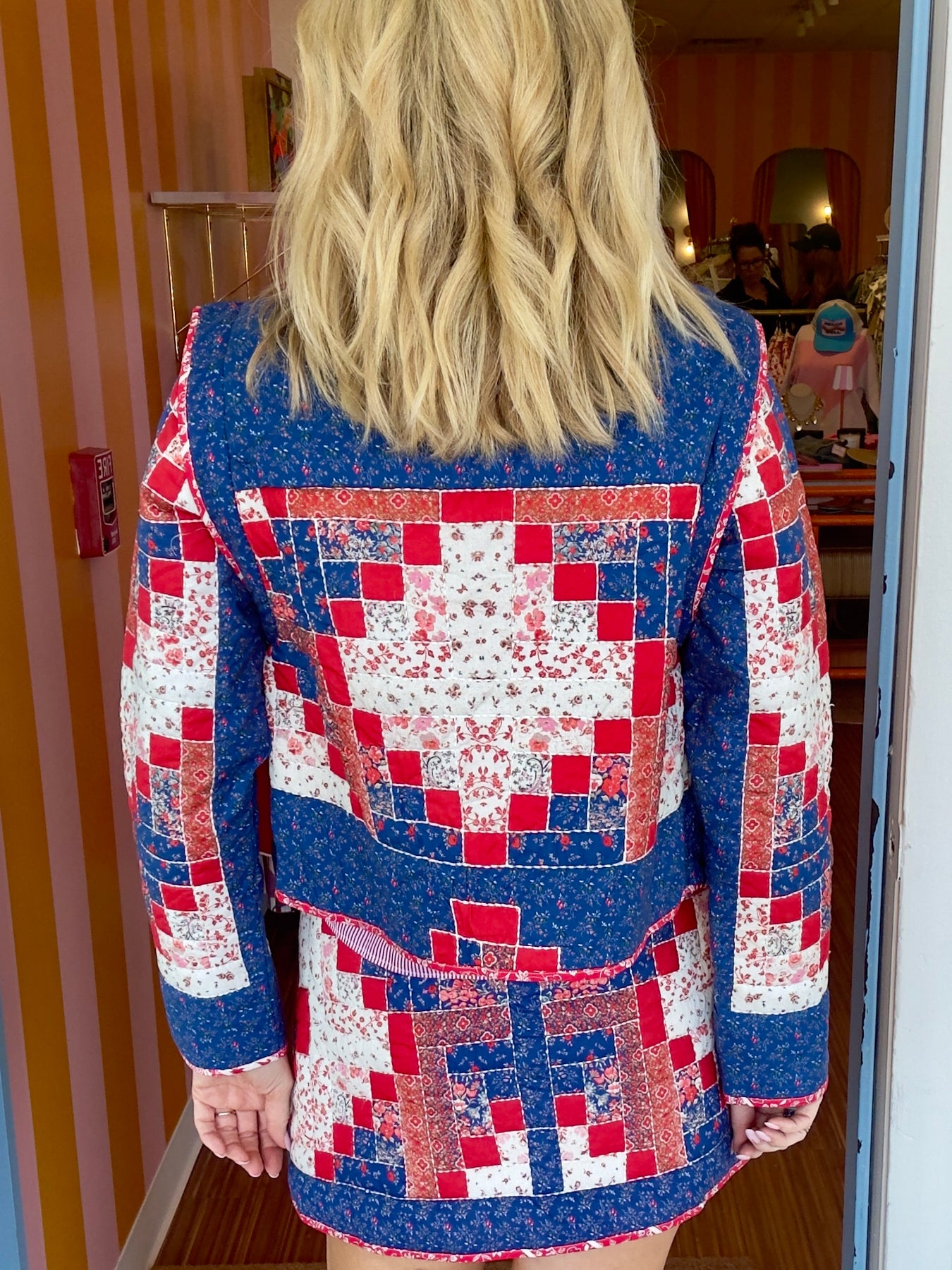 Darling oh so special quilted jacket in red white & blue patchwork detail.