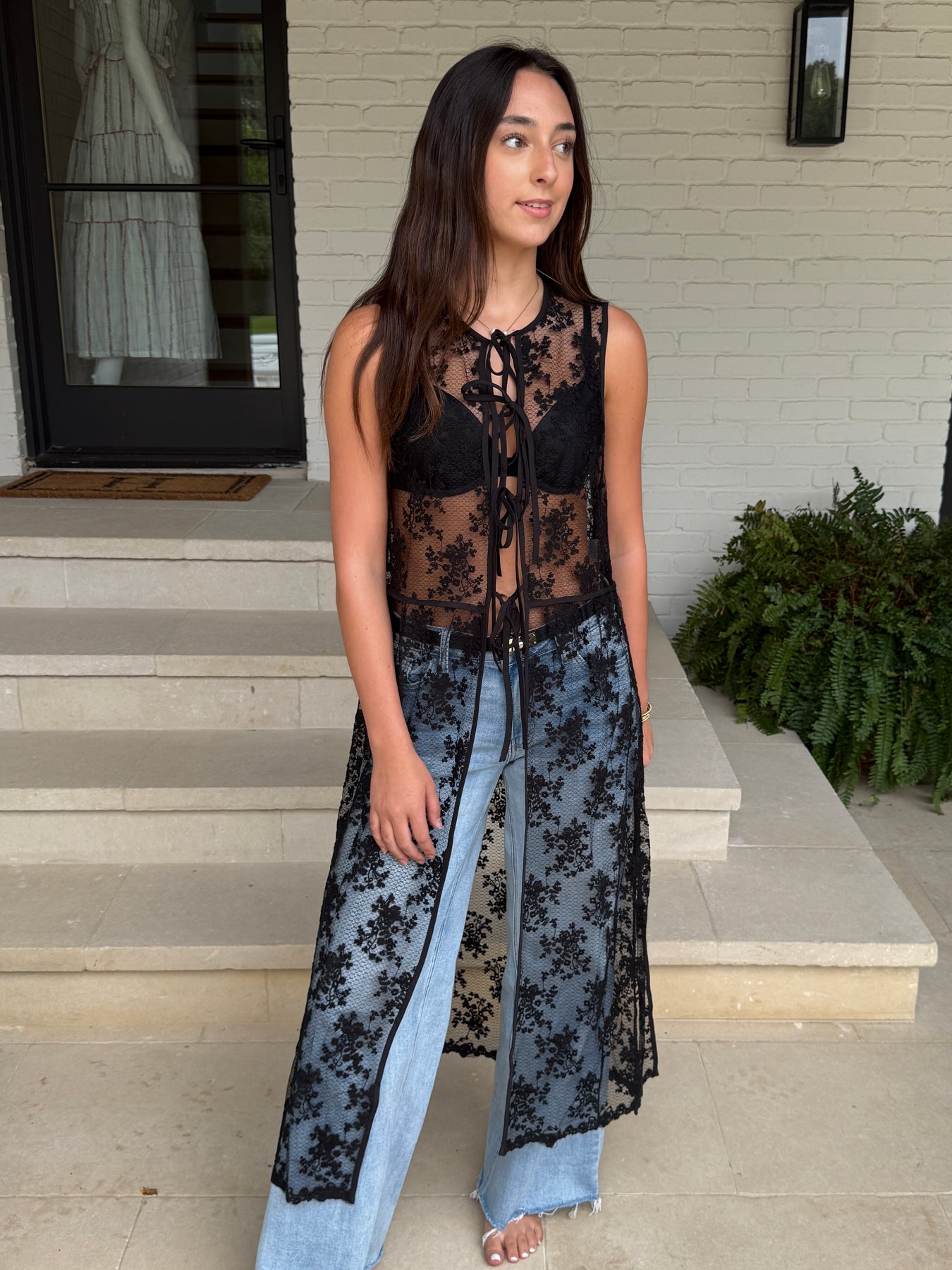 Our Lausanne vest is so versatile in a delicate lace fabric with tie closures at the bodice.   Lightweight and sheer this will layer over fall looks or summer.  Pefect with cutoffs now for a boho festival vibe or layered over denim.   Fabric:  Cotton, Nylon & Poly  Care:  Cold water wash and hang dry.  Fit is easy but true.