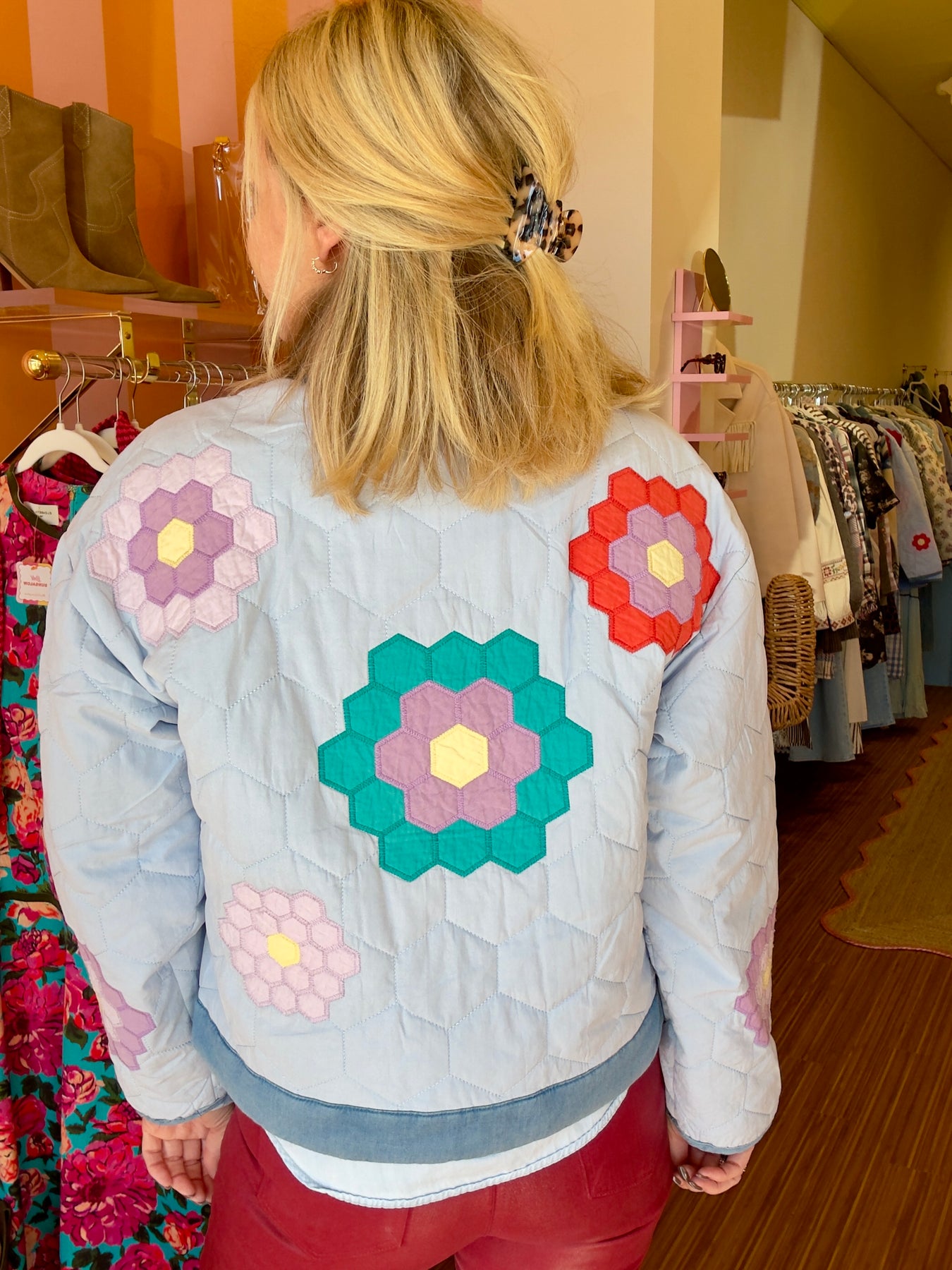 Chambray two tone lightly quilted with traditional bright colored pattern throughout. Made to wear as a light weight jacket. Slightly boxy.