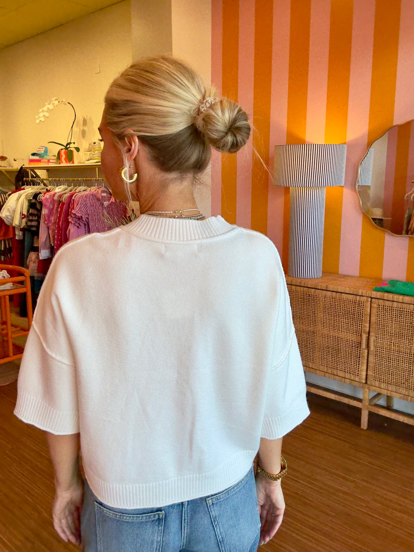 Easy fit bright white knit top with dropped 3/4 length sleeve and exposed stitch detail. Boxy fit order your true size.
