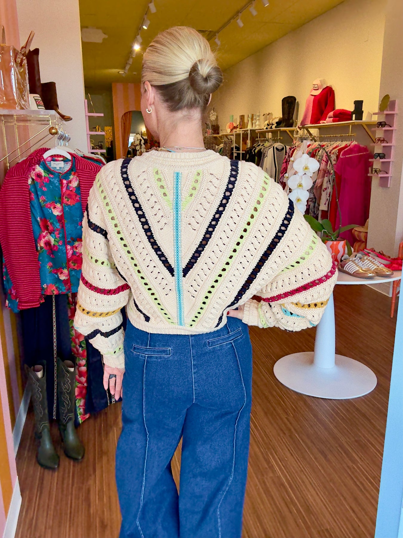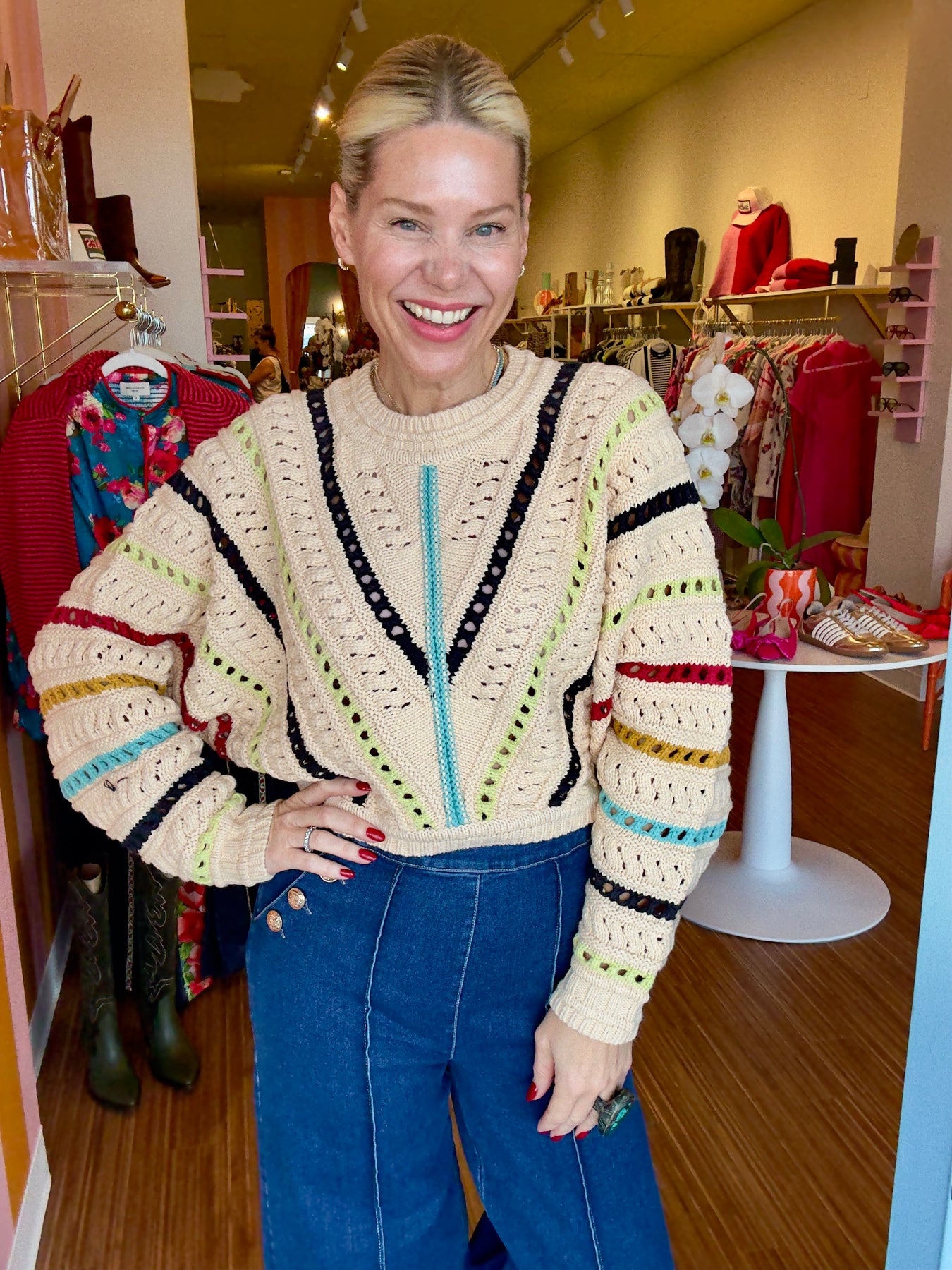 Loose stitch cotton sweater with dolman sleeve and cropped fit. Fit is true.