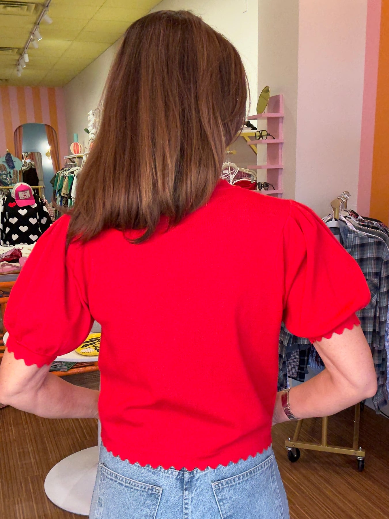 Short sleeve red cardigan with scallop details at neck, sleeve and hem. Fit is true.