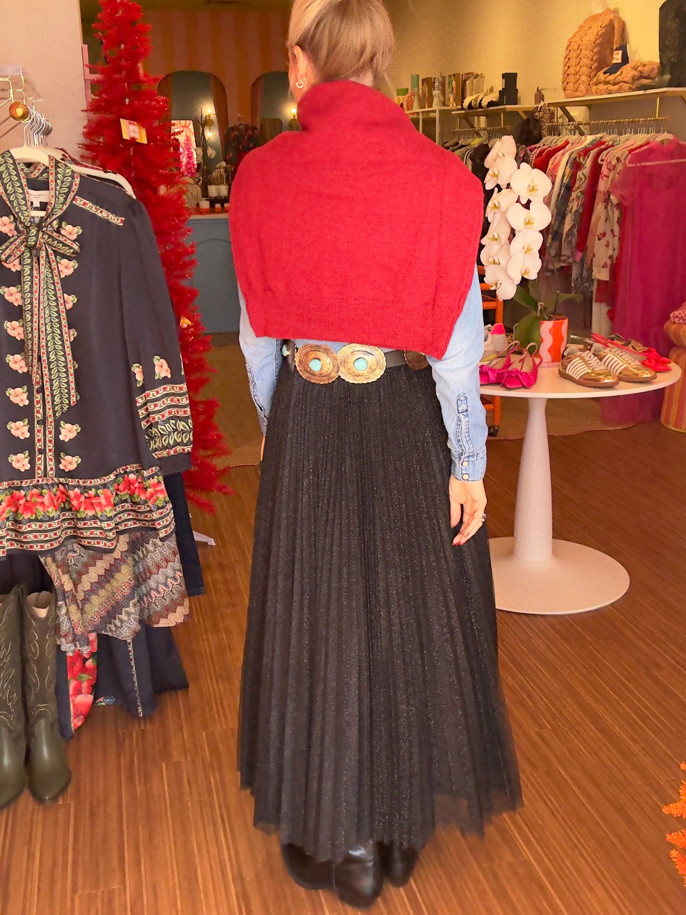 FINAL SALE Total showstopper!  Pleated midi skirt in black sparkle with elastic waist and tulle lining for extra drama.  Fit is true.