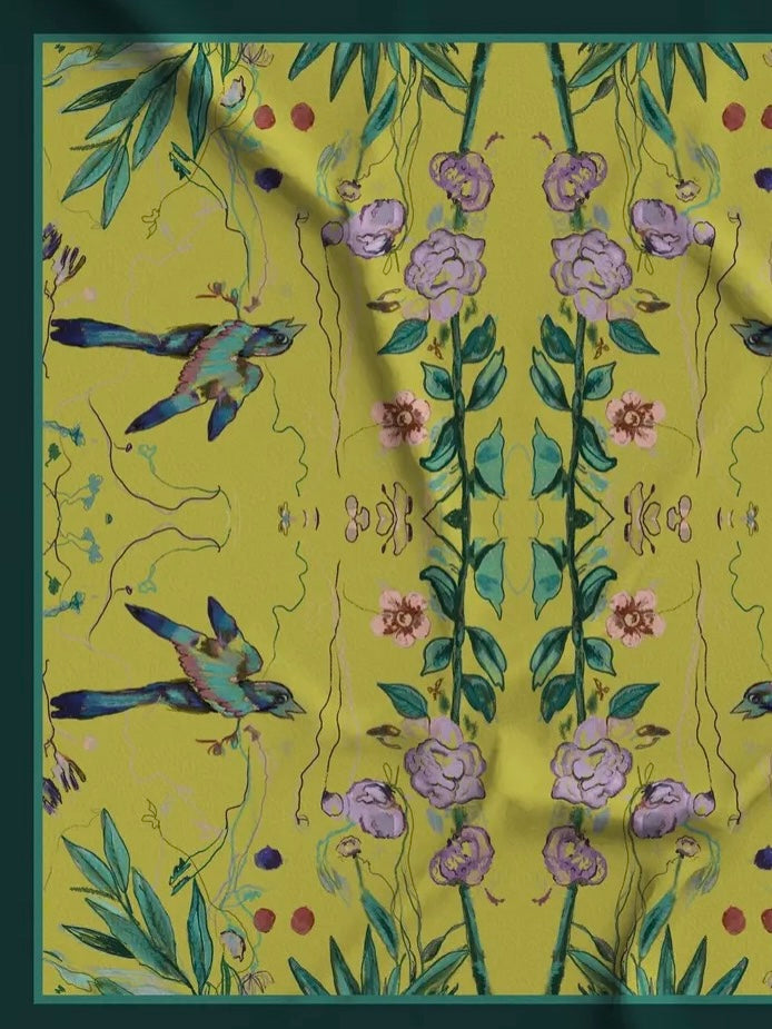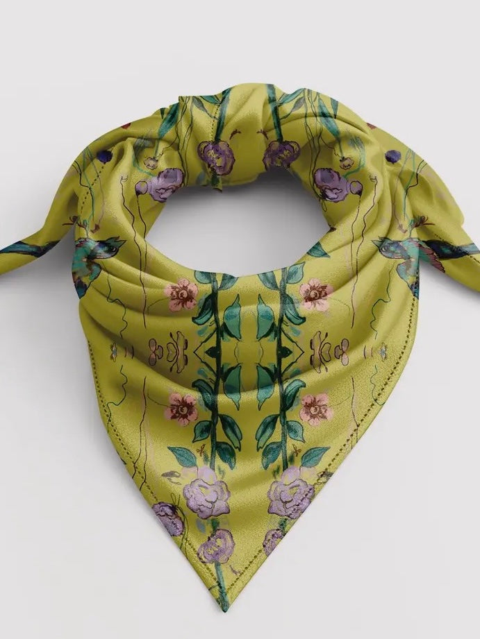 This gorgeous silk scarf from designer Wendy O'Connor is in a timeless design and would make the perfect gift. Featuring the vibrant colors of Windy's original Bird of a Feather Lime art design, this 35" x 35" scarf is crafted from 100% lightweight, 5 mm silk. Whether worn around your neck, as a headscarf, or tied to a handbag, it adds an elegant pop of color and creativity to any outfit.