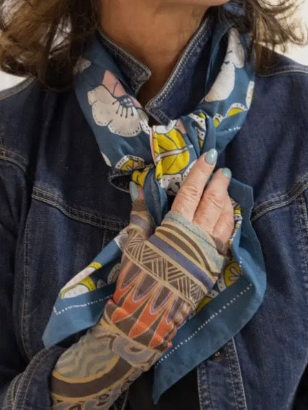 Our Evangeline teal bandana is 100% cotton and measures 34"x34". So versatile these cotton scarves can hold your hair back, carry an outfit, pick up spills, and store your beloved treasures and favorite snacks. The possibilities are endless with these hardworking, artfully designed handkerchiefs.