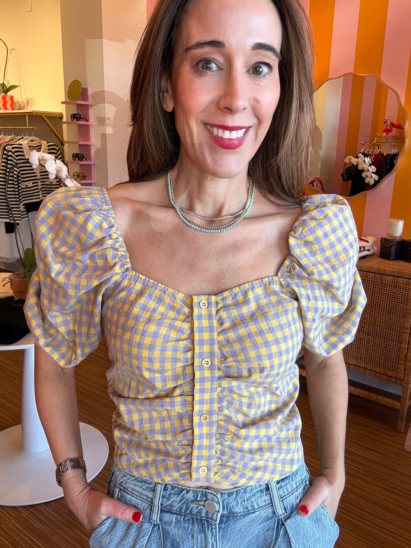 Our darling lavender & yellow check editor top has a puffed 3/4 sleeve, ruched front button placket and cropped fit. Perfect with high waisted jeans.