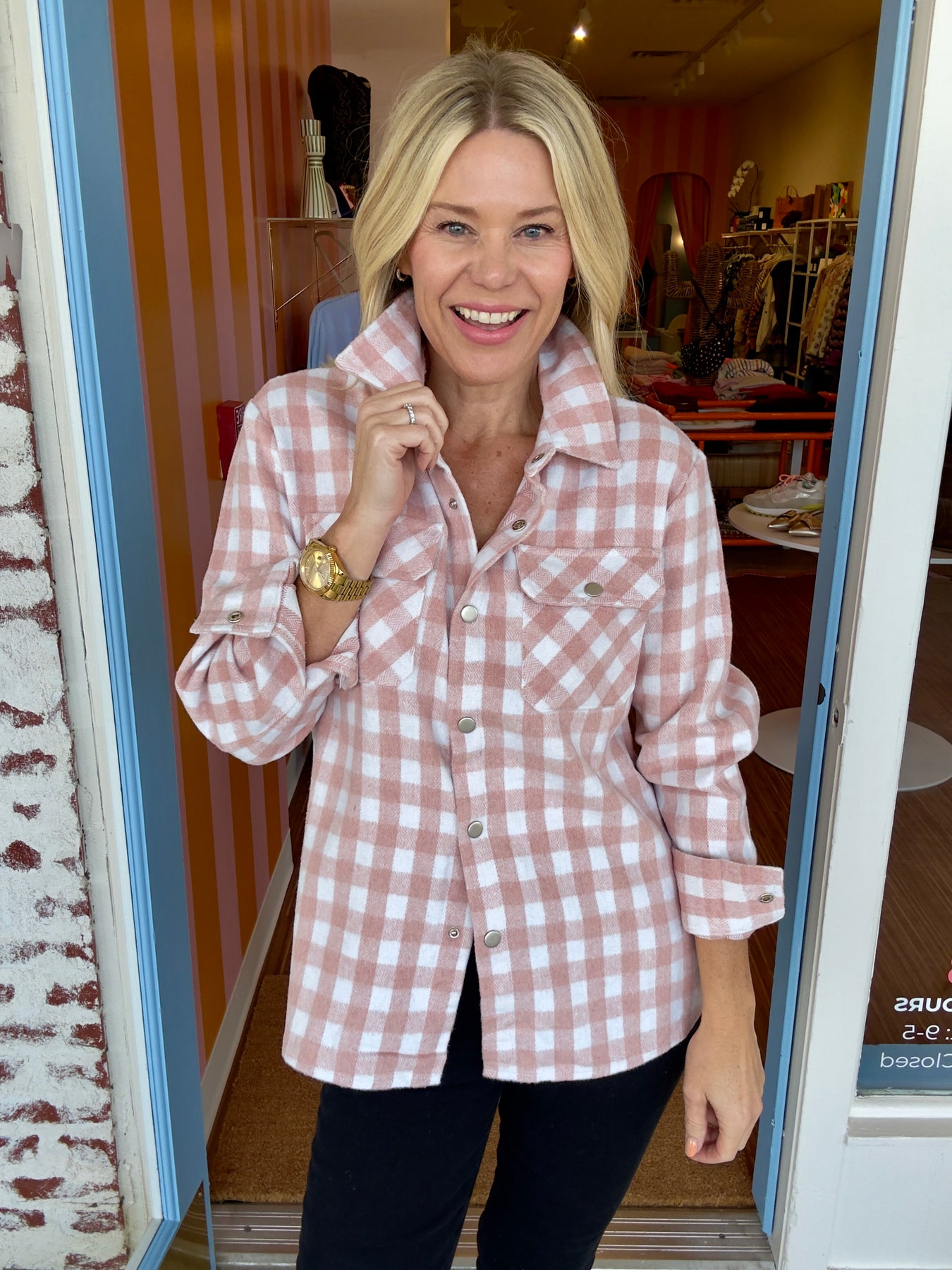 Pink gingham flannel shirt with snap front detail. Wear as a top or over our Hattie Henley for a layered look. Fit is true.