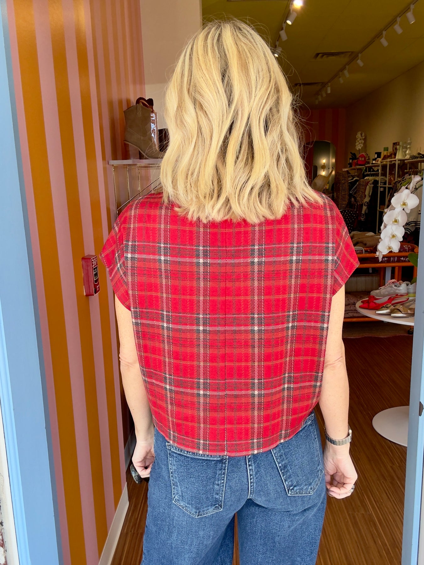 Plaid top with mock turtleneck and cap sleeve. Zips at back. Fit is boxy and true.