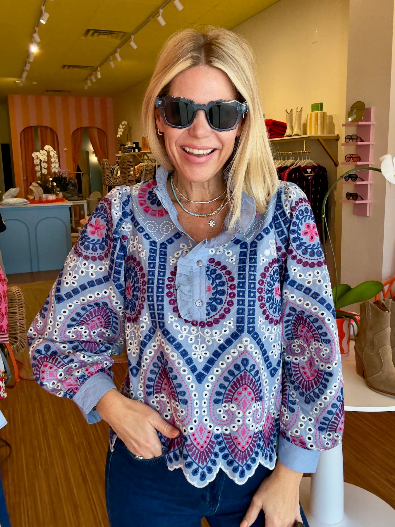 Embroidered eyelet top with ruffle detail at collar. Long sleeve with scallop hem. Lined through bodice. Boxy, but true fit.