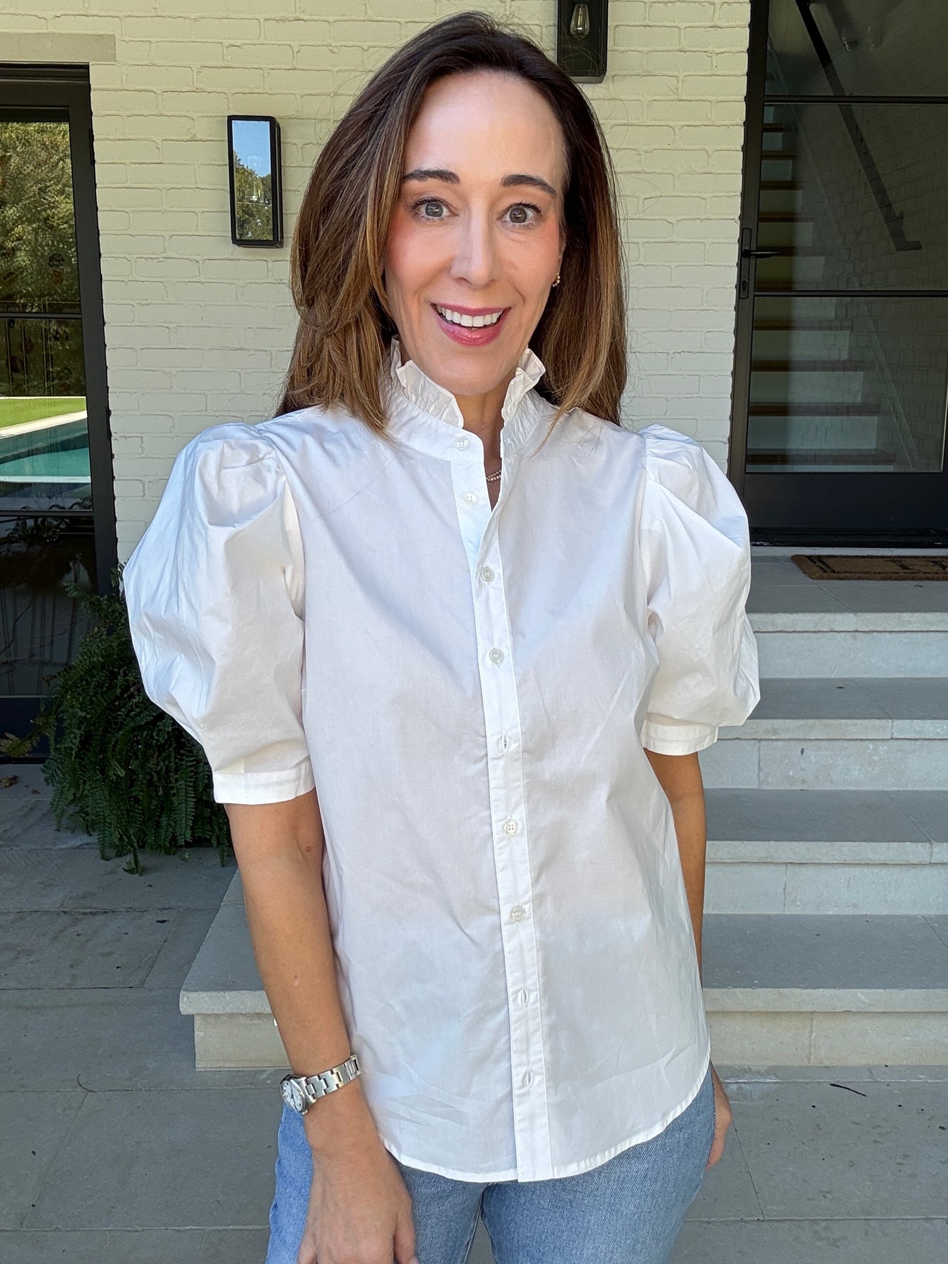 Solid white poplin top with ruffle neck and puff sleeve. An elevated basic that every wardrobe needs. Fit is true.