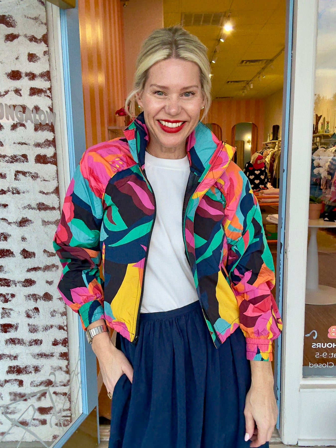 Floral jacket in tech fabric - perfect for running around town.  Matching short completes the set!  Fit is true.