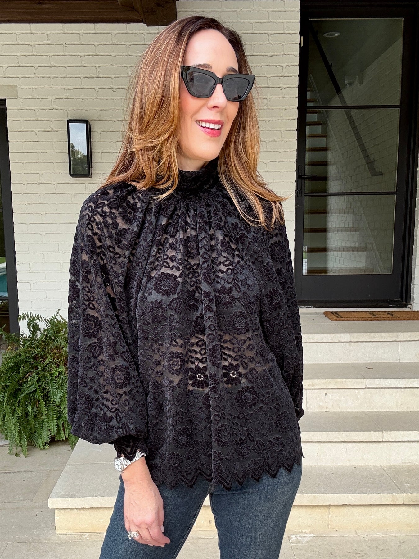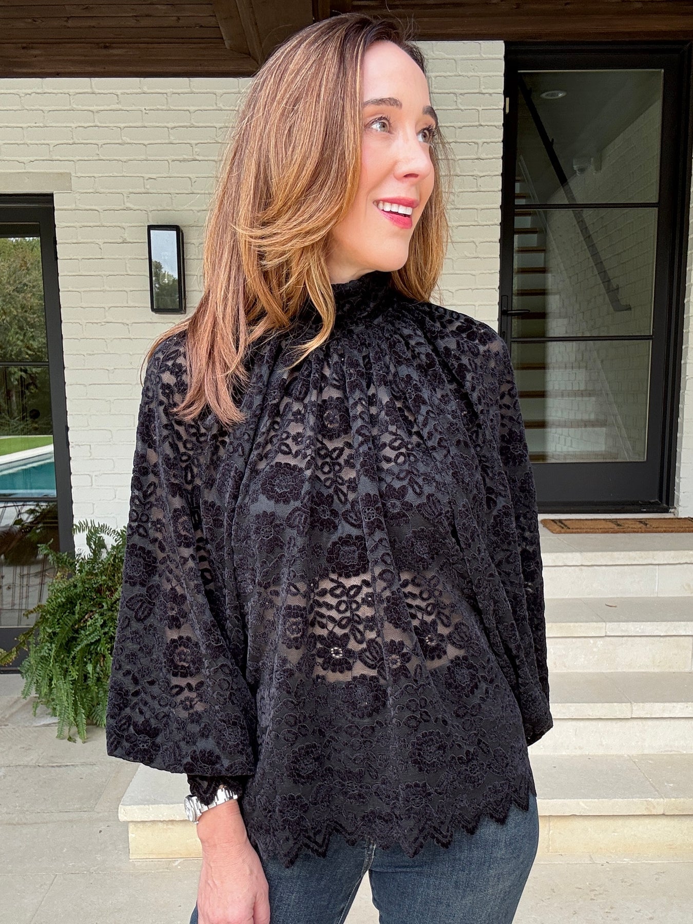 Straight from Paris our Corbeille top is an extra special piece that will be a mainstay in your closet. Made from a gorgeous black french lace with long cuffed sleeve, scalloped hem and mock neck detail. Pair with a bright pant for holiday or with black trouser and blazer for a work appropriate look. European sizing is very true.