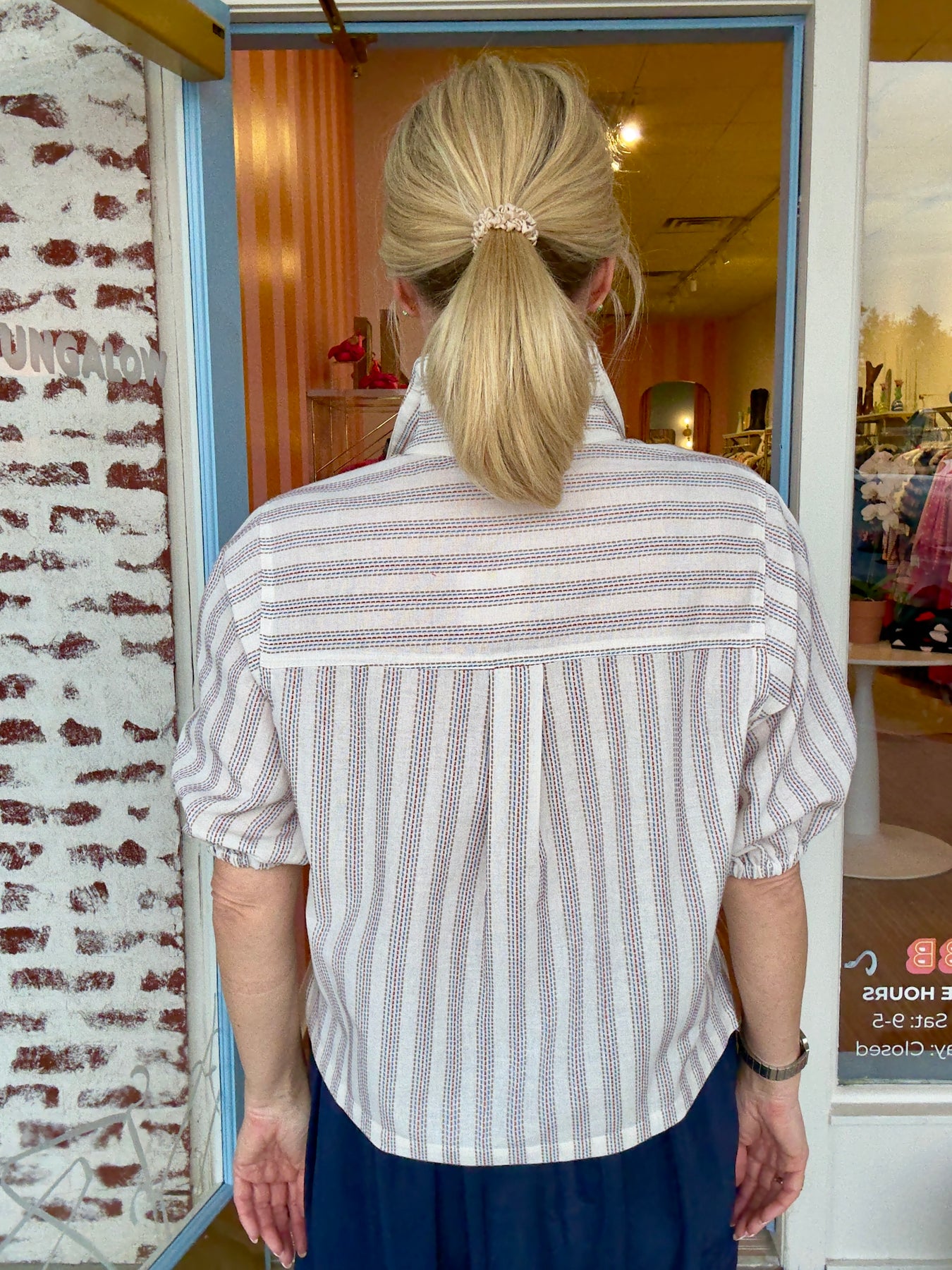Cotton top in ivory with stitched stripe in khaki, orange and blue. Perfect as a set with the matching short, or on it's own. Fit is loose and true.