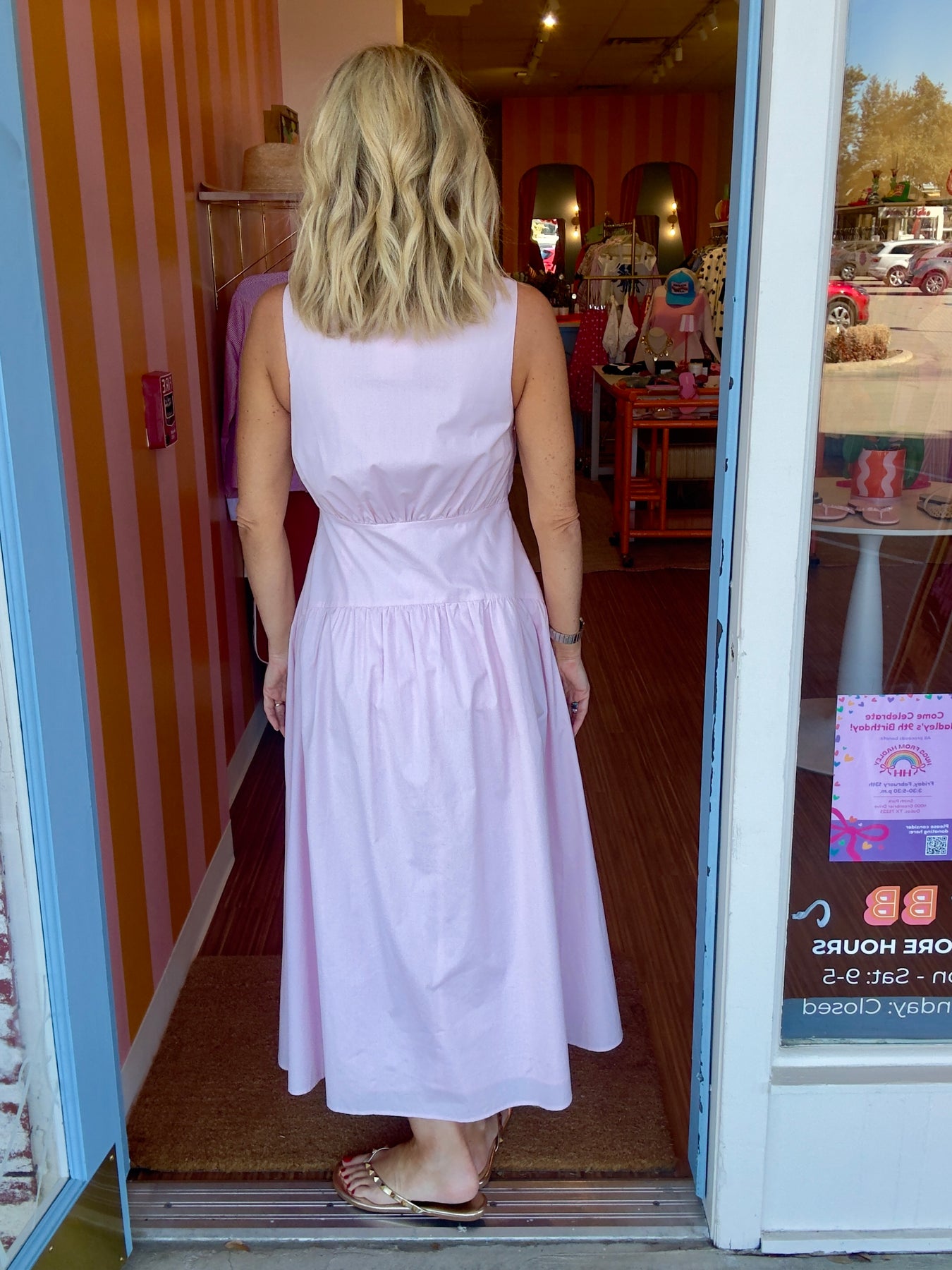 Crisp cotton poplin our Susannah dress in pale pink is the perfect dress for spring. Button front, fitted drop waist aline style. Fit is very true in this brand